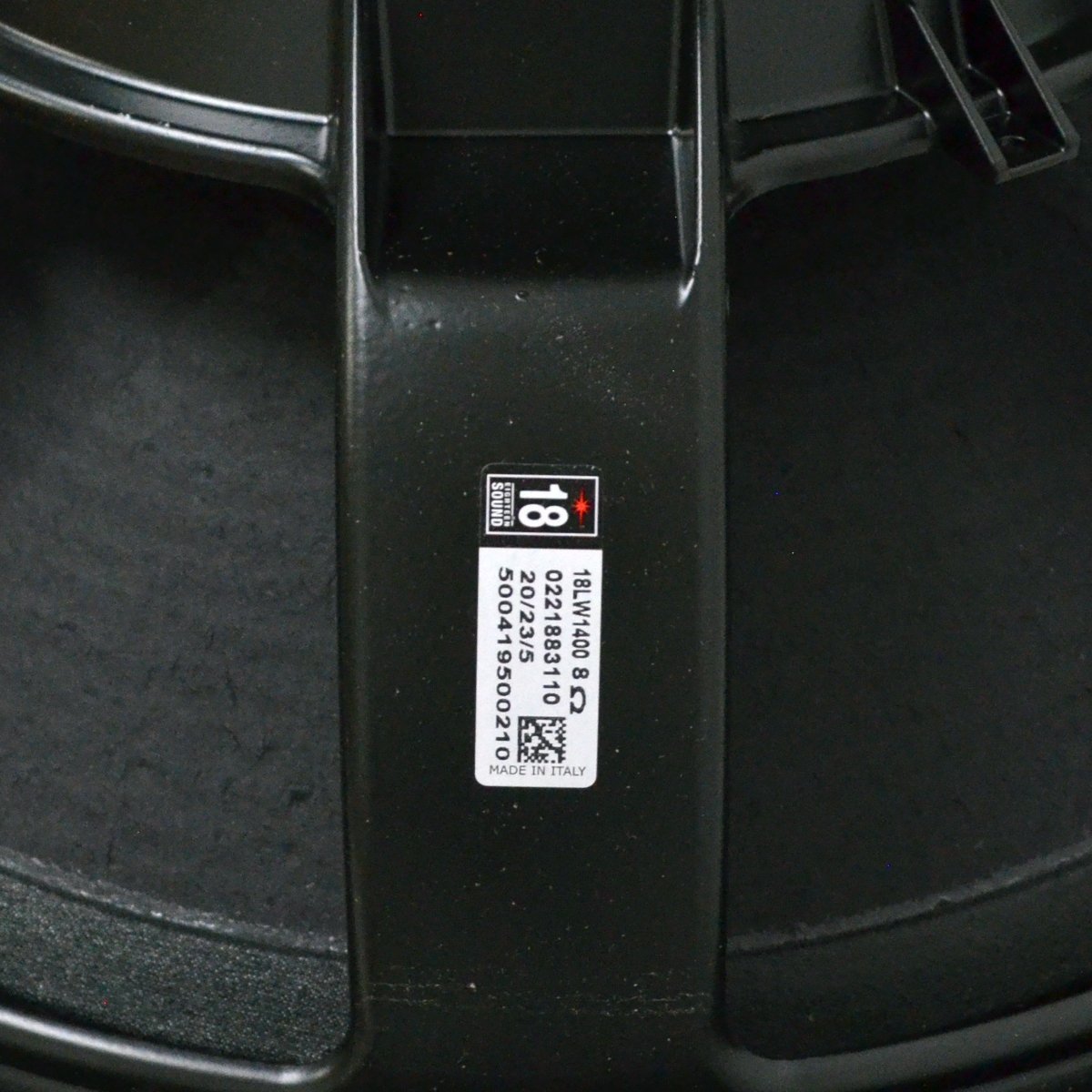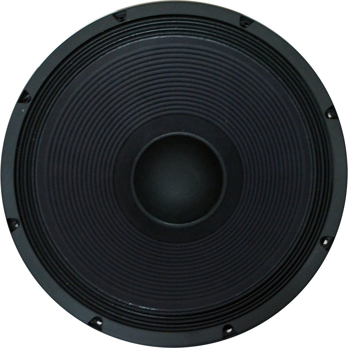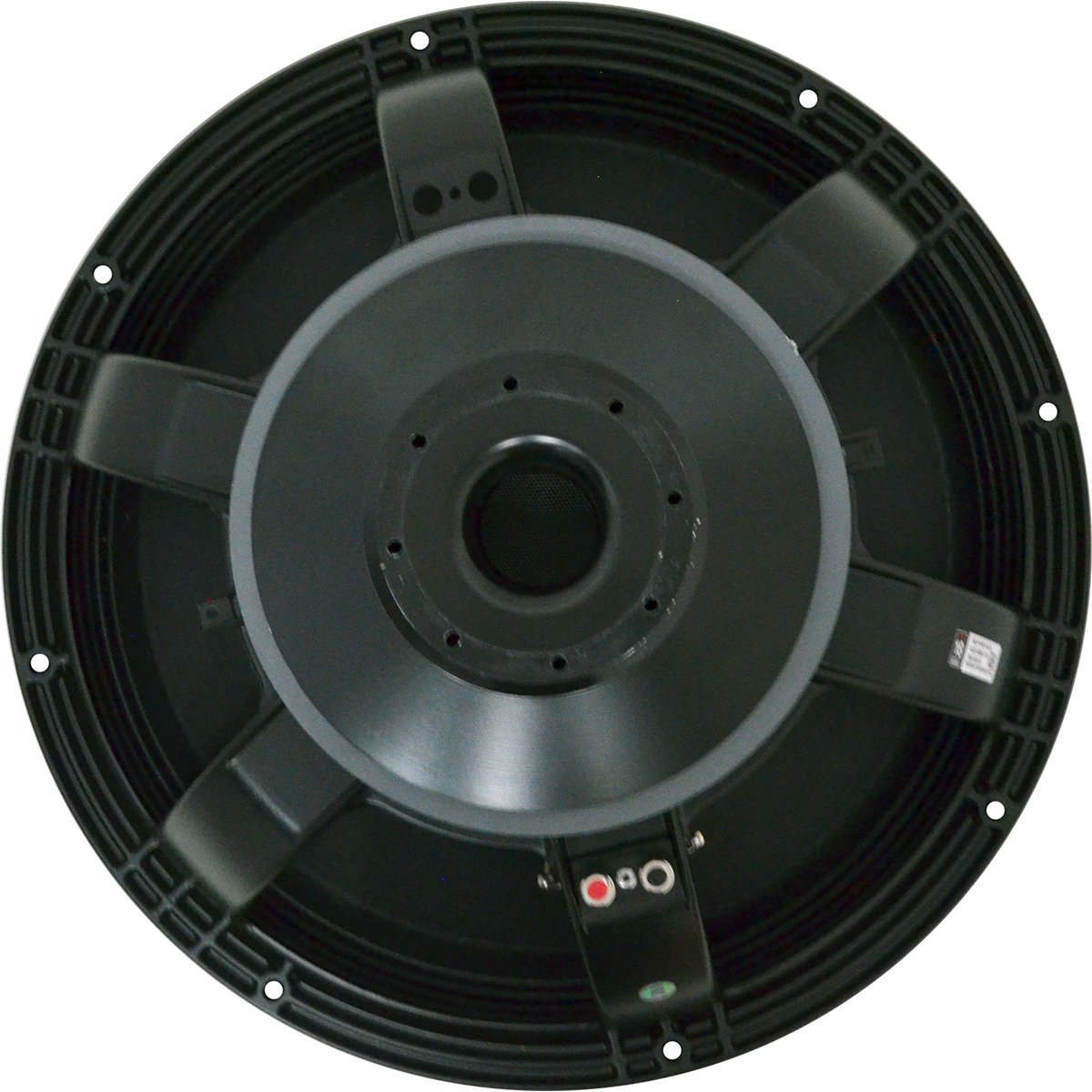 Bocina de 18″ pulgadas, imán de ferrita, cono acanalado recto reforzado con fibra de carbono, doble Silicon Spider (DSS) para mejorar el control de excursiones y linealidad, anillos de doble demodulación (DSS) para una menor distorsión, disipación mejorada de calor a través del diseño único de canasta u múltiples rejillas de ventilación de la placa posterior, conos y platos protegidos contra la intemperie para uso en exteriores, ideal para diseños de subwoofer de alto SPL, impedancia: 8 ohms, potencia AES: 1,000 W, programa: 1,400 W, pico: 7,000 W, sensibilidad: 98 dB, rango de frecuencia: 28 – 2,500 Hz, bobina móvil de cobre de 4” pulgadas (100 mm), peso: 13.3 kg.