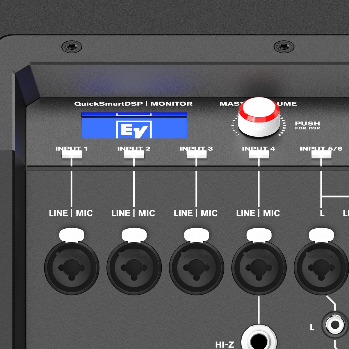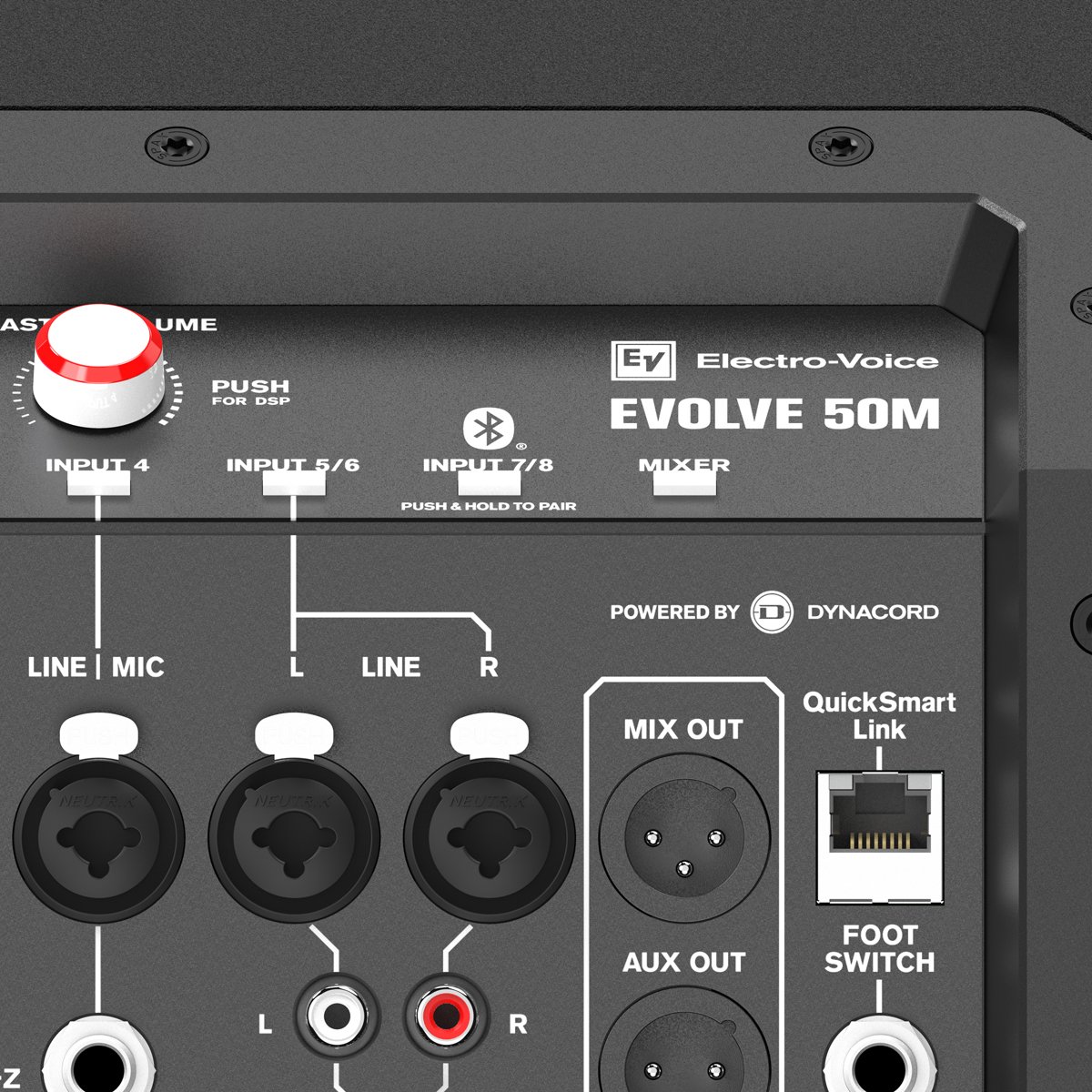 Como novedad de Electro-Voice, QuickSmart Link facilita la combinación de dos EVOLVE 50M para su uso junto con bandas más grandes o conciertos que necesitan más entradas. Simplemente conecta los sistemas a través de un cable Ethernet para crear una conexión de control de audio digital sin compresión, empareja ambos sistemas con un sólo dispositivo móvil a través de la aplicación QuickSmart Mobile (disponible a través de la App Store y en Google Play) y obtén un control total de la mezcla de ambos sistemas. Para aplicaciones que requieren menos entradas, pero que aún requieren una mezcladora y una salida estéreo, e EVOLVE 50M se puede combinar con un EVOLVE 50 a través del conector MIX OUT XLR.