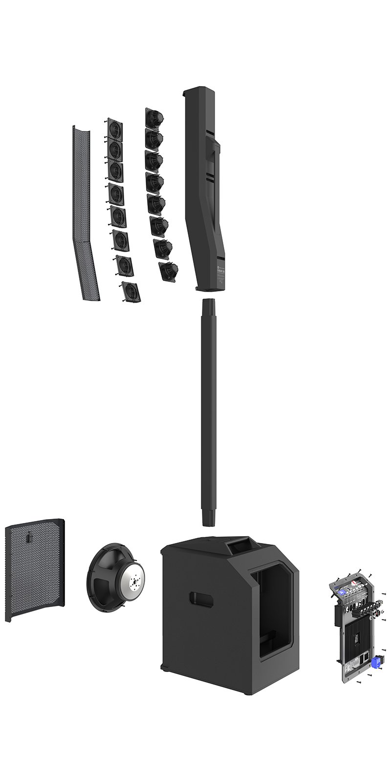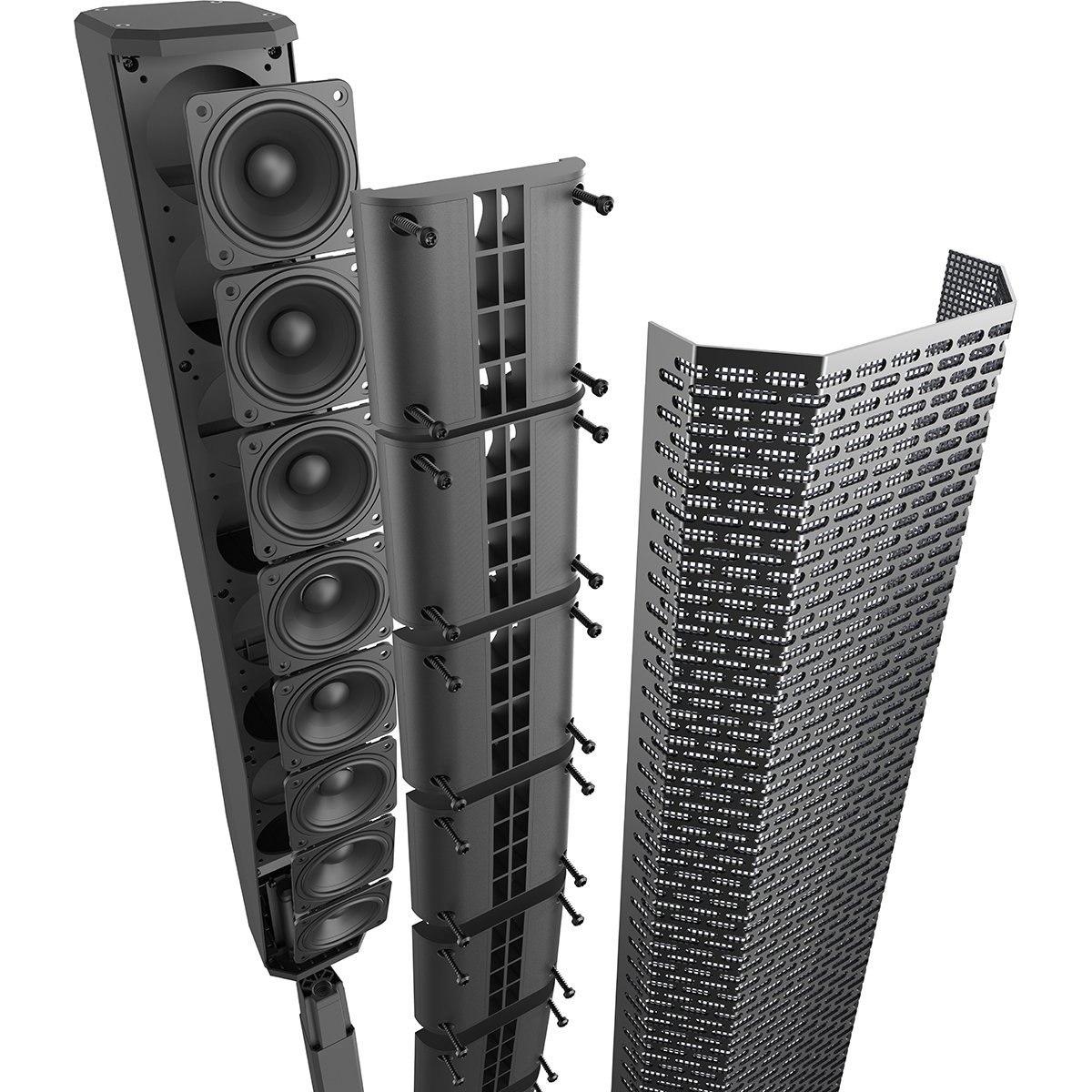 La matriz de columna de rango completo y sus ocho drivers ligeros de neodimio de 3.5″ pulgadas brindan una cobertura ultra ancha de 120° grados de ancho de banda completo mediante guías de onda patentadas, la cobertura vertical asimétrica de 40° grados formada en matriz, garantiza que la salida acústica se dirija hacia los espectadores tanto sentados como de pie.