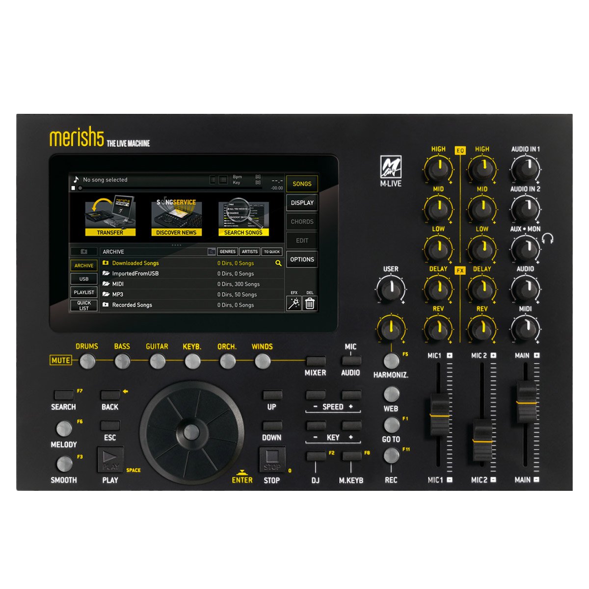 Una sola máquina para tocar y cantar profesionalmente. El dispositivo independiente dedicado a leer, archivar y reproducir pistas de acompañamiento digitales que contiene todas las funciones de Merish 5 con el doble de velocidad y la posibilidad de editar archivos de audio en pistas separadas con archivos MTA (formato creado por M-Live). Lee y reproduce archivos con la extensión .wav / .aac / .ogg / .flac / .aif / .au , también con el Plug In Prompter suministrado que le permite conectarse en el escenario a dispositivos como tabletas o teléfonos inteligentes para ver de forma remota múltiples estaciones de letras y acordes de las canciones que se están reproduciendo.