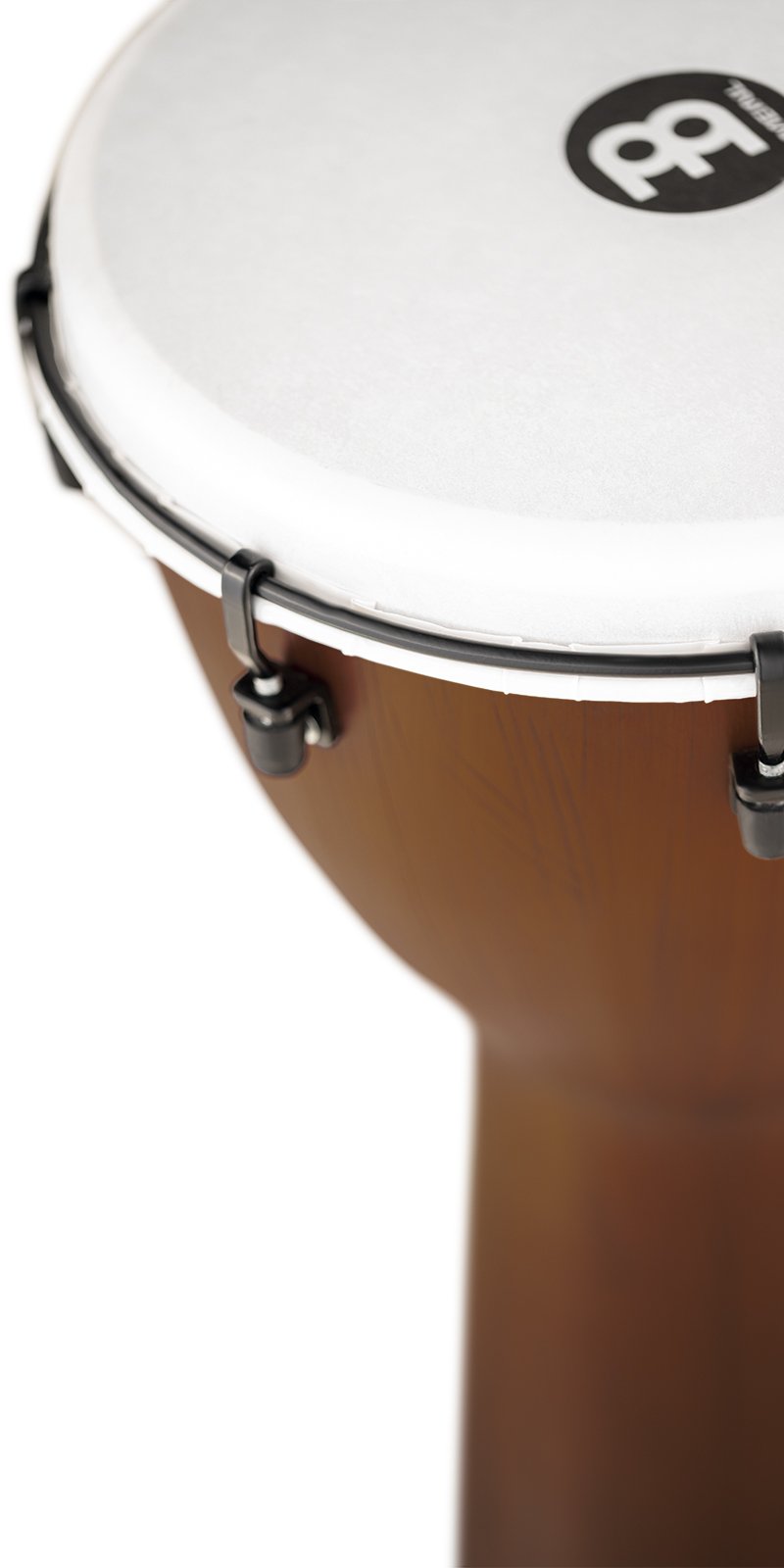 Donde la goma se encuentra con las salidas de gira, por así decirlo, sellamos la parte inferior de los djembe Alpine con un forro de goma duradero. Este es un elemento de diseño son el que estos djembes no podrían prescindir. Son ideales para poder tocar en aceras de concreto o para apoyar el tambor sobre el césped cuando se toca en un círculo de tambores al aire libre.