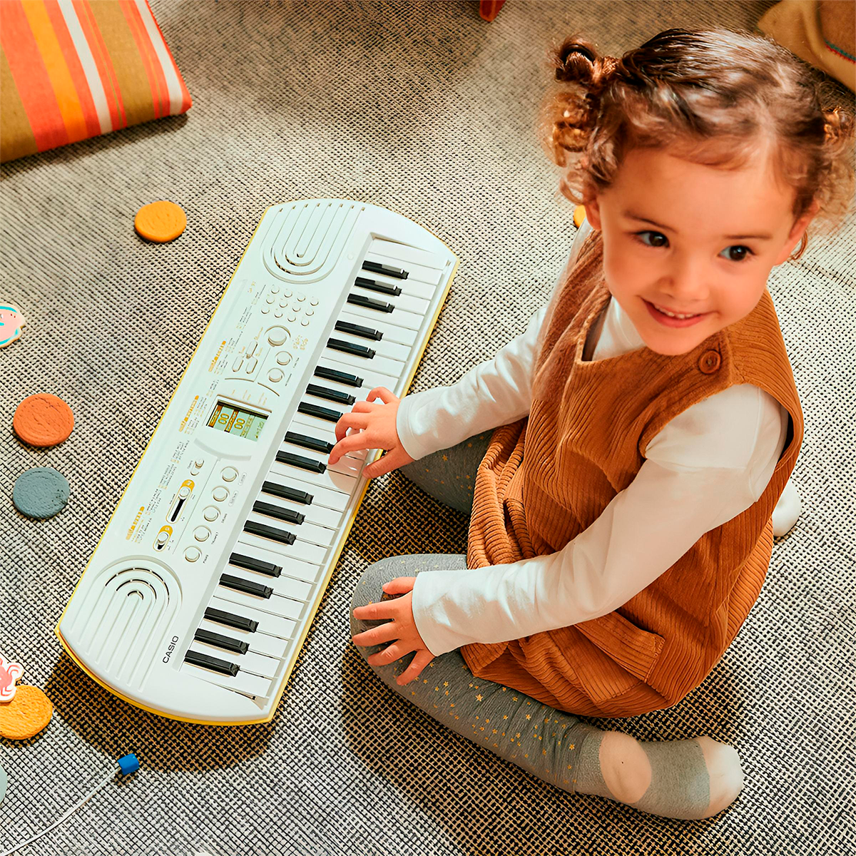 Teclado con 44 teclas pequeñas que facilitan su uso, incluso para manos pequeñas. Cuenta con 100 tonos incorporados de alta calidad, 50 patrones de ritmo, 10 canciones incorporadas, botones de tono directo, una pantalla LCD de tres niveles y puntos completos y una polifonía máxima de 32 notas. Permite que el sonido se reproduzca (sostenga) después de soltar la tecla, cambio de octavas, ajustes en la afinación, transposición de las notas y mantener o ajustar el tempo y el metrónomo.