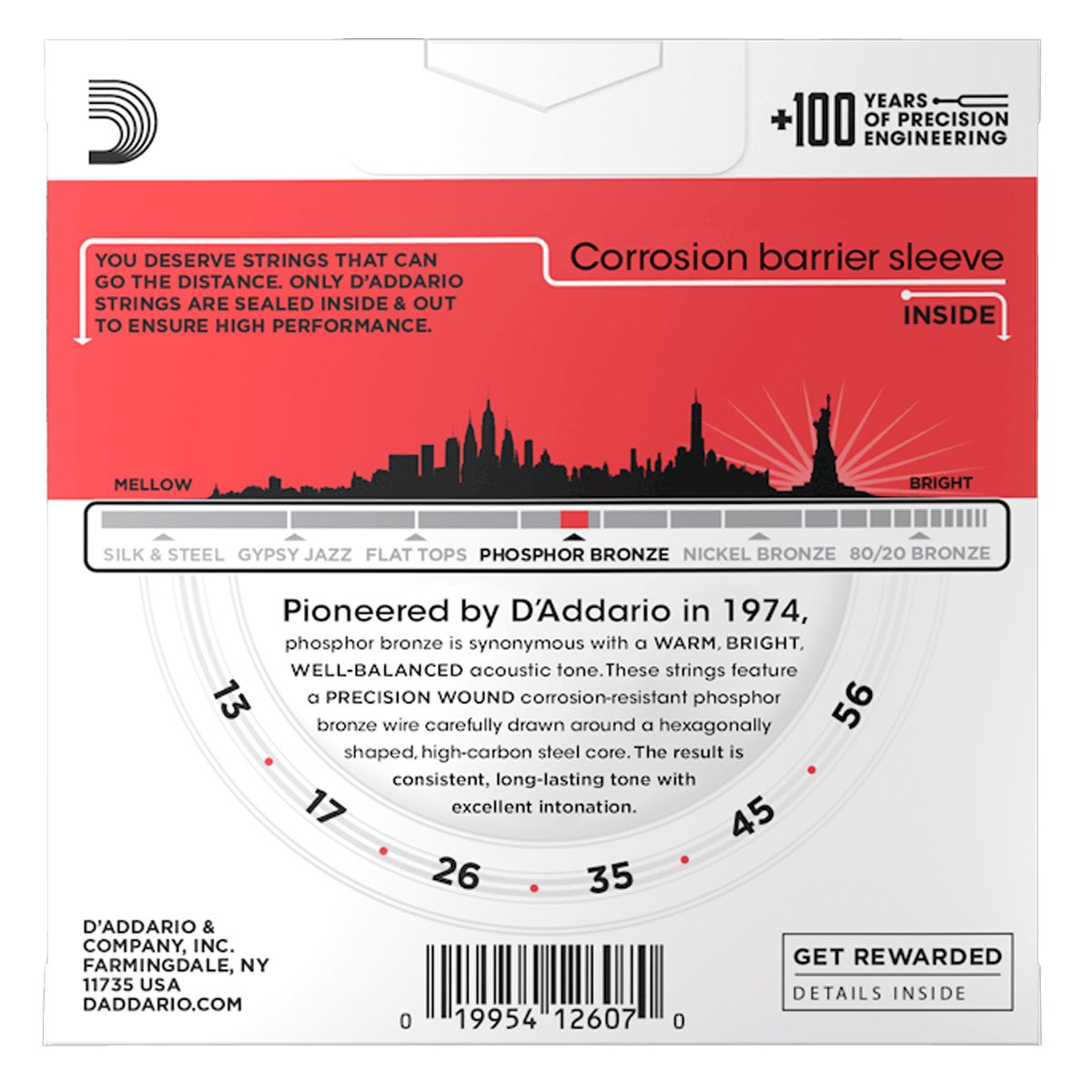 D´Addario fue el primero en utilizar Phosphor Bronze en cuerdas de guitarra acústica en 1974. Hoy en día, Phosphor Bronze se toca en todo el mundo y se considera el estándar en cuerdas acústicas, gracias a su hermoso equilibrio sonoro y calidez tonal. Nuestras cuerdas pioneras para guitarra acústica Phosphor Bronze están entorchadas con precisión con alambre envolvente de bronce fosforado sobre un núcleo de acero con alto contenido de carbono, lo que proporciona una versatilidad tonal adecuada para todos los estilos acústicos y géneros musicales. Las cuerdas 13-56 de calibre medio proporcionan máximo volumen y proyección, con más tensión y resistencia.