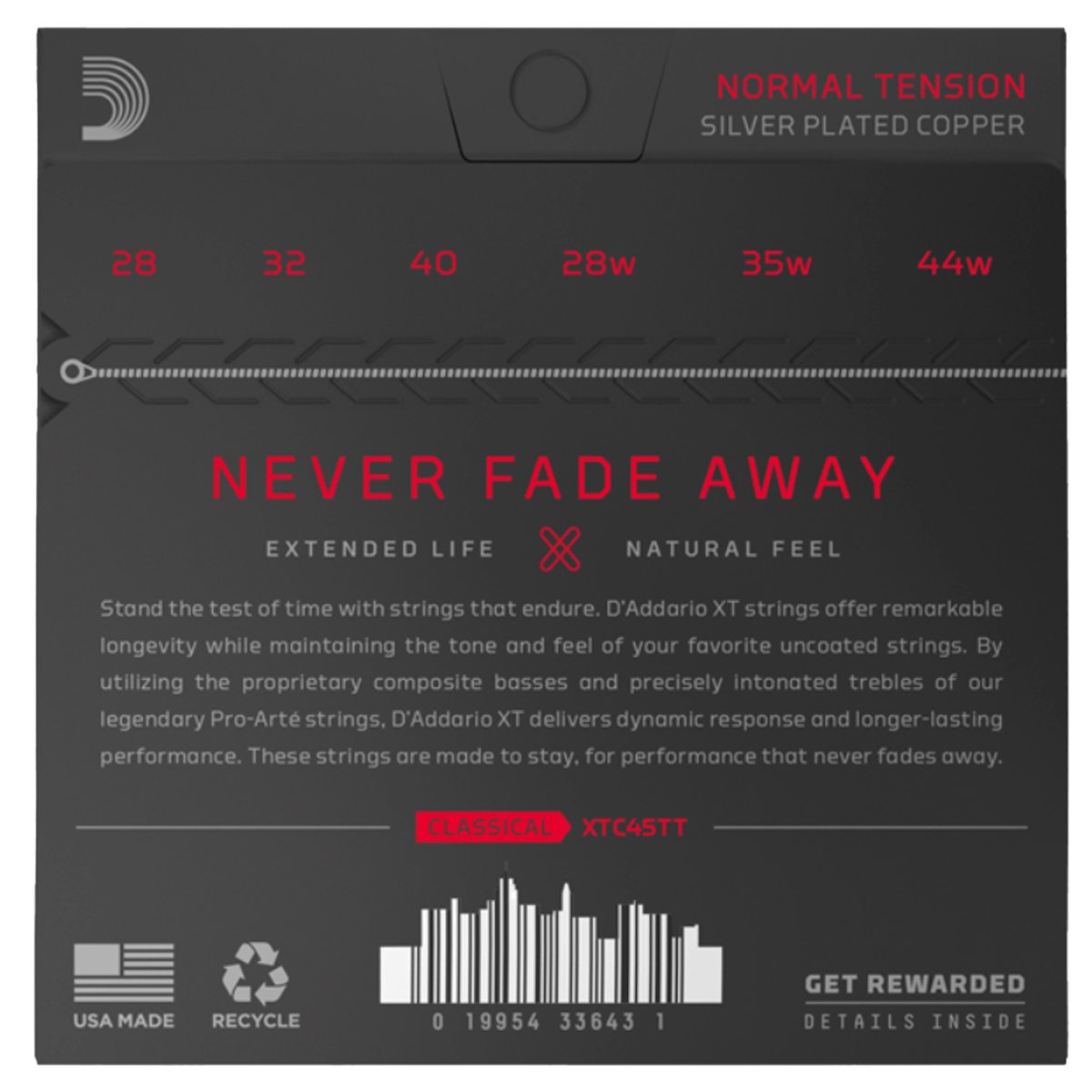 XT son nuestras cuerdas clásicas de mayor duración, que combinan siglos de experiencia de D´Addario con tecnología de recubrimiento moderna. Las cuerdas de bajo Dynacore de este juego XT utilizan una revolucionaria técnica de procesamiento de núcleo de nailon multifilamento para ofrecer una entonación incomparable, un ataque receptivo y una proyección nítida, y con la adición de nuestro revestimiento XT patentado, una vida útil significativamente mayor. Junto con nuestros agudos de titanio de precisión, que proporcionan un equilibrio distintivo y una mayor resonancia, XT Dynacore es la cuerda clásica más avanzada disponible. Este conjunto de tensión normal es nuestro voltaje más vendido, preferido por su equilibrio de tono rico, sensación cómoda y proyección dinámica.