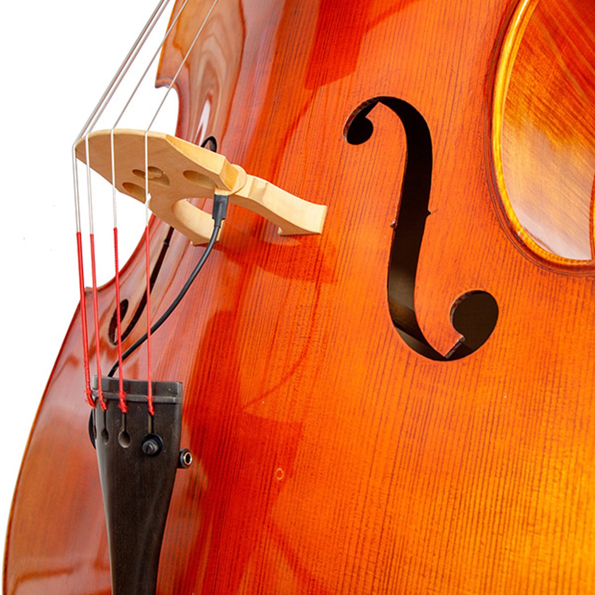 Un sensor piezoeléctrico revestido de madera se instala en la ranura del ojo del puente y se mantiene en su lugar mediante fricción. Los discos de cuña cuidadosamente terminados aseguran el ajuste perfecto. La carcasa del conector de 1/4″ se asegura de forma no destructiva al cordal con un conjunto de tornillos en el ojo de la cuerda.