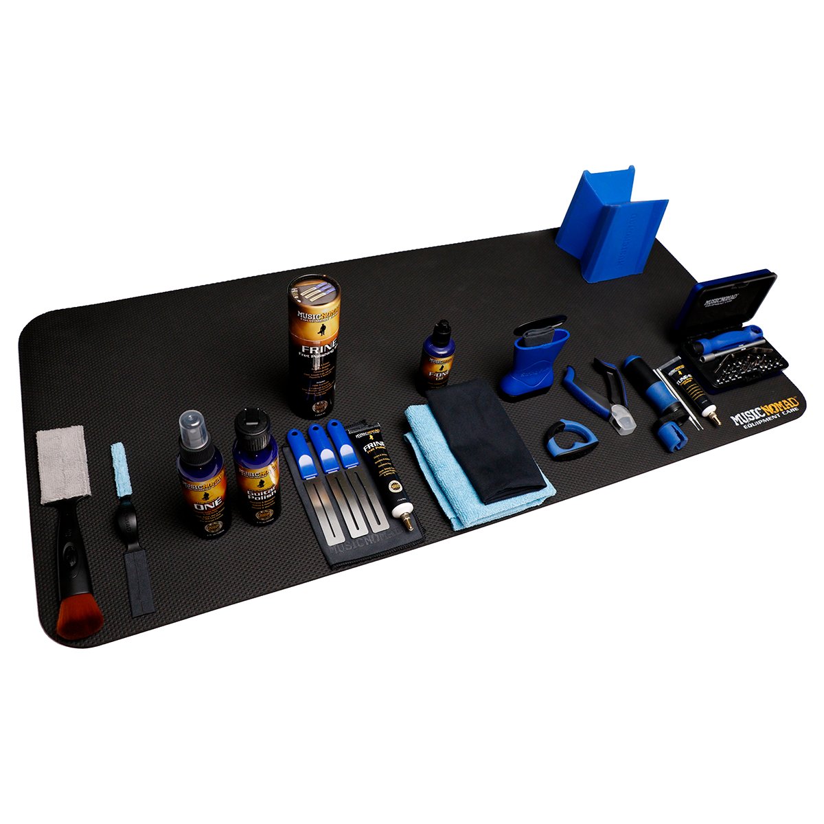 Configura tu set con lo que los mejores técnicos de gira y talleres de reparación usan todos los días para hacer que el equipo con el que trabajan se vea, suene y funcione mejor. La estación de trabajo Ultimate At Home Work Station incluye 11 de nuestros imprescindibles productos. Comienza con nuestro elegante tapete de trabajo de primera calidad y nuestro innovador soporte para el brazo que te permite trabajar de manera segura en cualquier instrumento de cuerda. Luego te entregamos todo el producto para detallar, limpiar, pulir y acondicionar todas las áreas necesarias para mantener y proteger tu equipo. Por último, incluimos todas nuestras herramientas premium de cambio de cuerdas, por lo que el cambio de cuerdas es muy sencillo. Más el juego de herramientas de 26 piezas Guitar Tech que te permite ajustar todo tu equipo excepto el alma. Cada producto está diseñado y fabricado para ser el mejor de su clase. No te decepcionará y esperarás la próxima vez que trabajes en tu equipo.