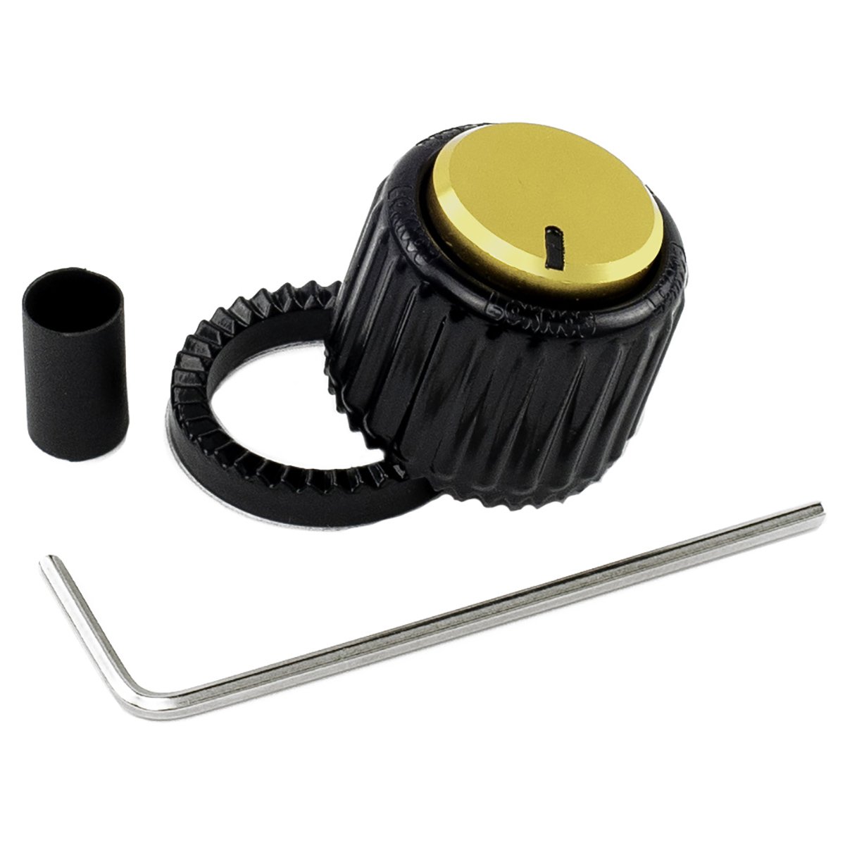 Perilla Loknob con seguro, una vez en su lugar simplemente gire la perilla para marcar el sonido que necesitas, se adapta a la mayoría de los amplificadores, pedales de efectos, instrumentos y equipo para estudio o en vivo, grande, color negro/dorado.