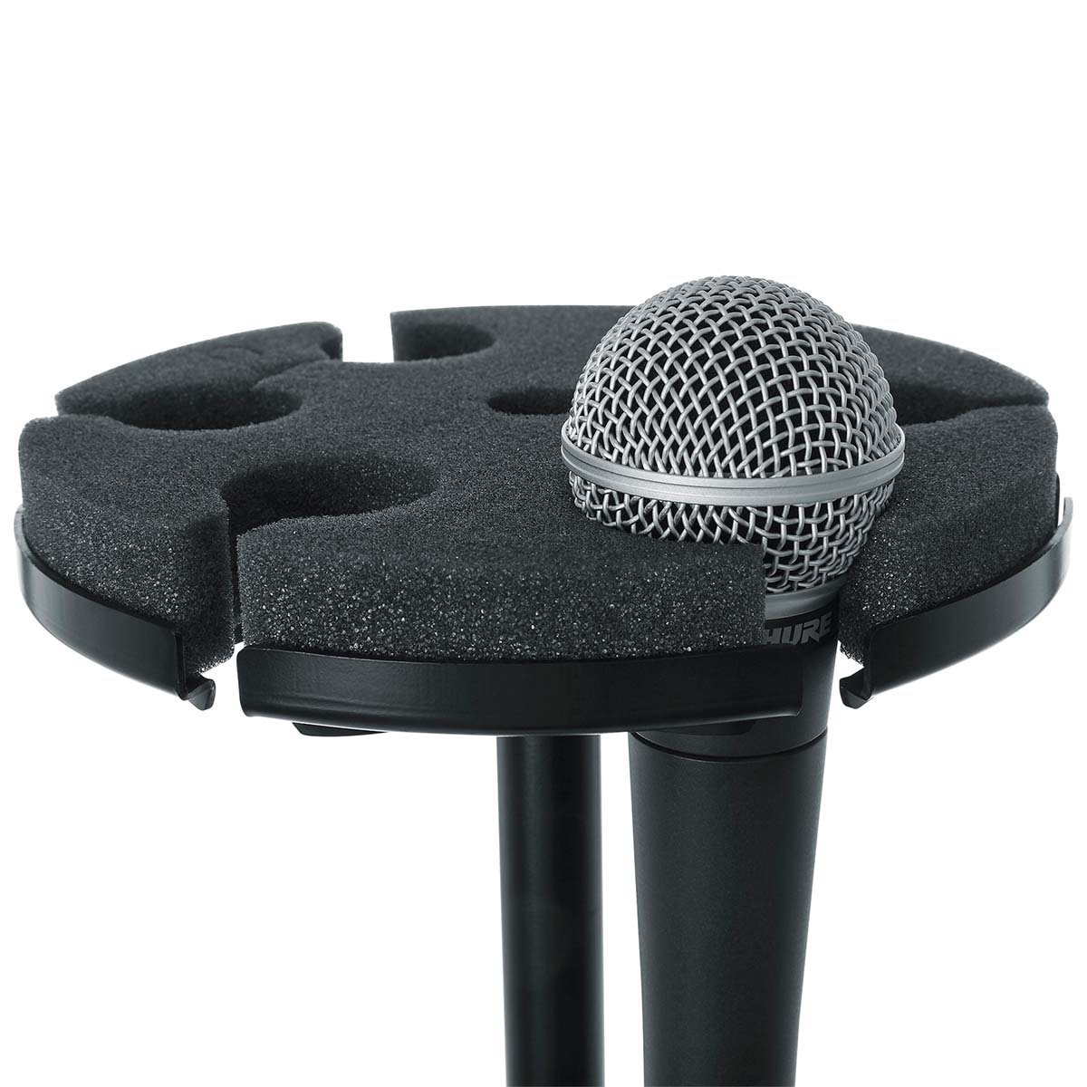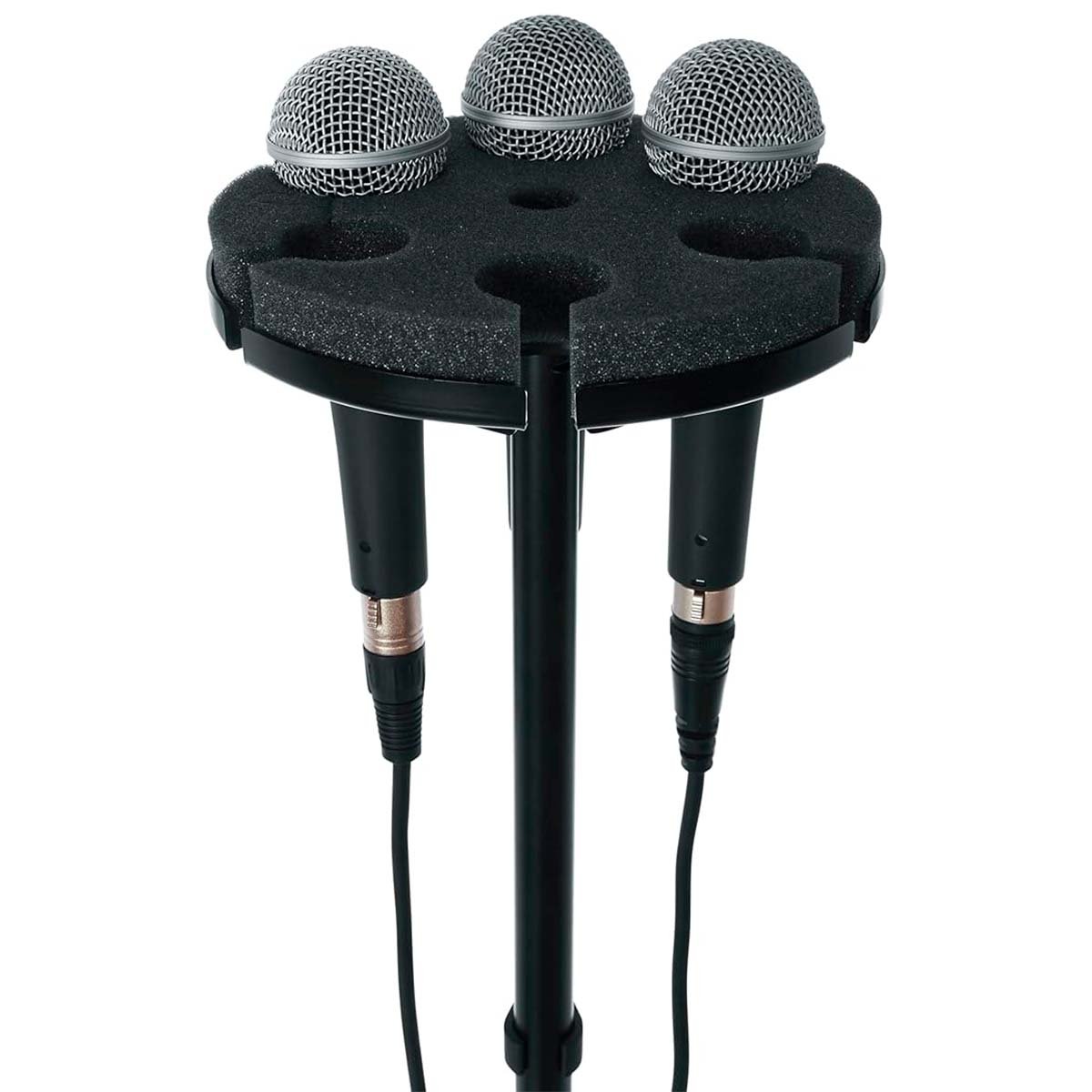 Su diseño circular permite ahorrar espacio y proporciona un acceso cómodo a todos los micrófonos. La base está acolchada con espuma, lo que protege los micrófonos de golpes y reduce el ruido al colocarlos o retirarlos. La bandeja es compatible con micrófonos de cabeza de bola estándar, y su sistema de rosca hembra de 5/8″-27 permite una fijación rápida y segura a la mayoría de soportes de micrófono estándar.
