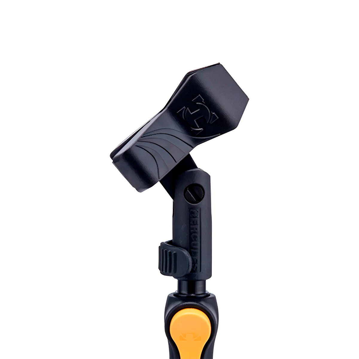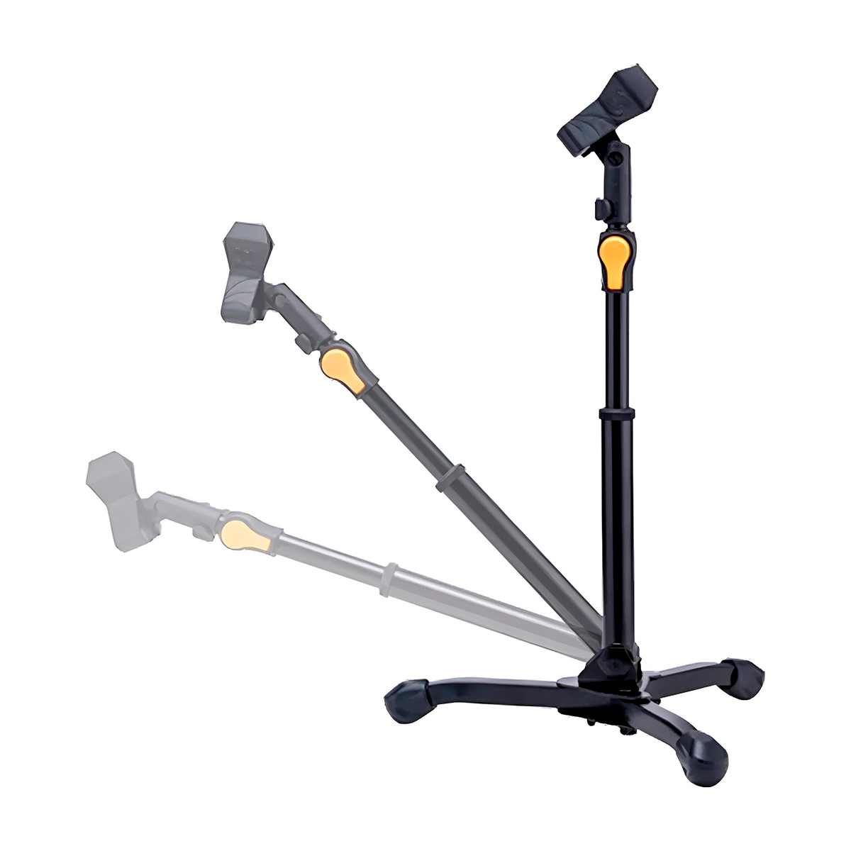 El Hercules MS300B PLUS destaca por su diseño todo en uno, ideal para aplicaciones de sobremesa o microfoneo en espacios reducidos. Su sistema EZ Grip permite ajustar la altura con una sola mano de forma rápida y precisa, mientras que la base inclinable facilita orientar el eje entre 45° y 90° para lograr el ángulo perfecto. Las patas giratorias del trípode se ajustan de manera independiente para adaptarse a otros equipos y se pliegan fácilmente para un transporte cómodo y seguro.
