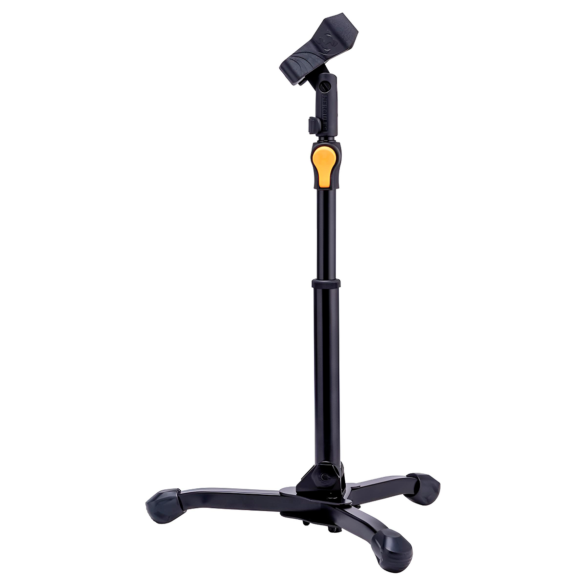 Soporte de micrófono de sobremesa con base de trípode, ideal para grabaciones, microfoneo de bombos o aplicaciones discretas. Incorpora el sistema EZ Grip, que permite ajustar la altura con una sola mano (335–430 mm), y una base inclinable para una colocación precisa del micrófono. Sus patas giratorias facilitan la adaptación en espacios reducidos, mientras que su estructura ligera de 1.1 kg soporta hasta 3 kg de carga. Radio de base: 170 mm; tamaño plegado: 98 × 72 × 310 mm.