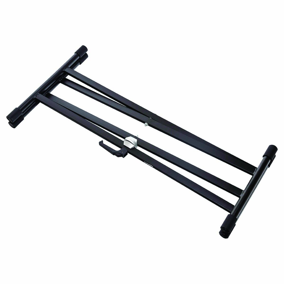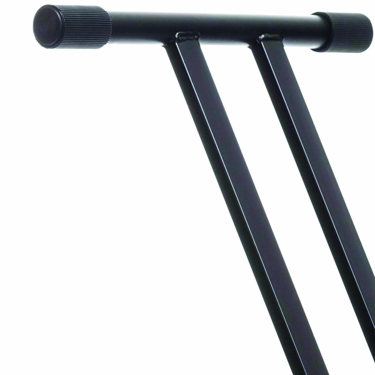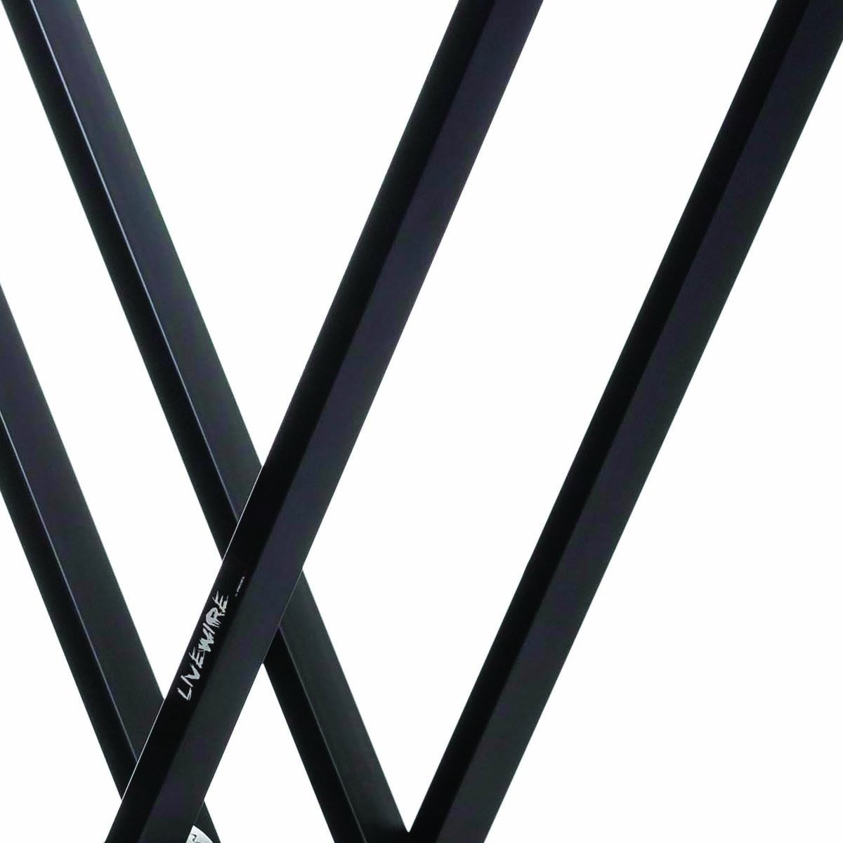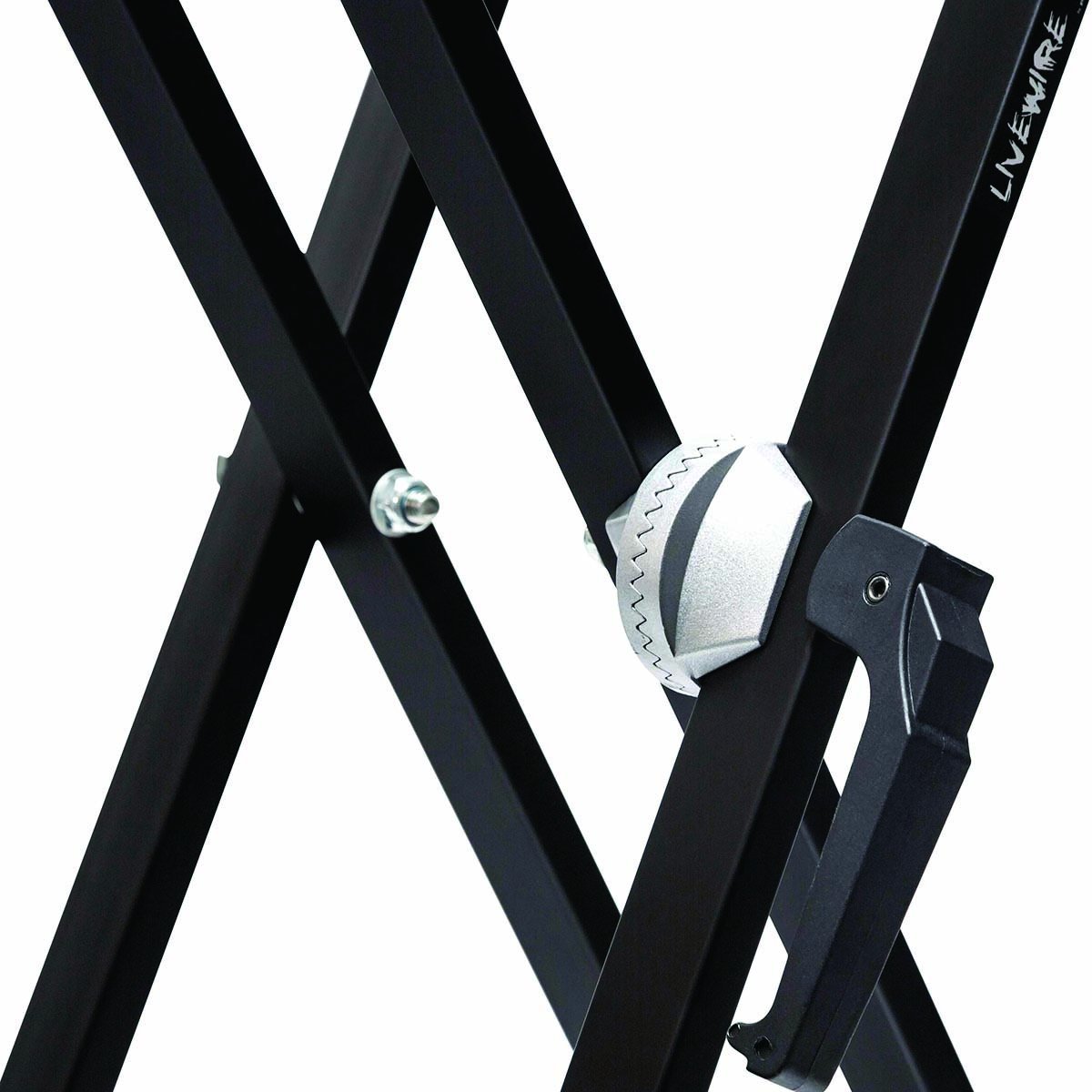 Soporte para teclado tipo X, fabricado con acero de alta calidad, doble marco, junta de aluminio, manija ergonómica, tapa de goma ajustable, terminado en color negro mate, etiqueta Livewire en el producto.