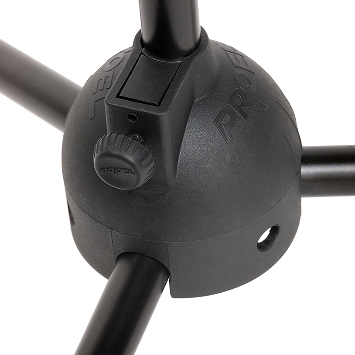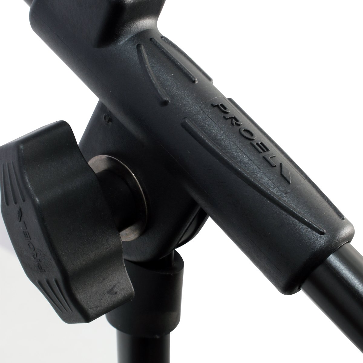 Soporte de micrófono con boom, base trípode de nylon. Esta línea de micrófonos ha resultado ser altamente competitiva desde su introducción. Su éxito se encuentra en el uso de componentes de alta tecnología a precios competitivos, diseño creativo y estabilidad. Estos soportes están hechos con materiales elegidos con precisión, como todas las articulaciones deslizantes de nylon y los insertos de latón que otorgan una elevada y duradera calidad.